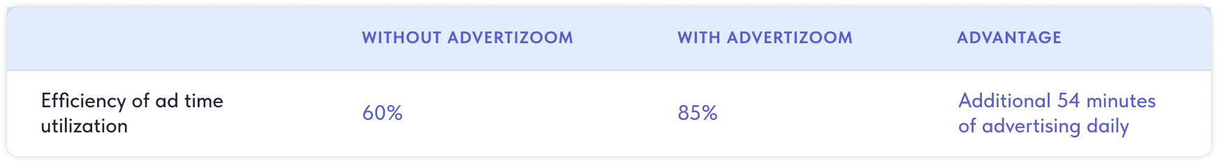 With AdvertiZoom's innovative features and real-time optimization capabilities, TV channels and advertisers can streamline their advertising processes, increase ad effectiveness, and maximize their return on investment. Save time, enhance efficiency, and achieve better results with the AdvertiZoom system!